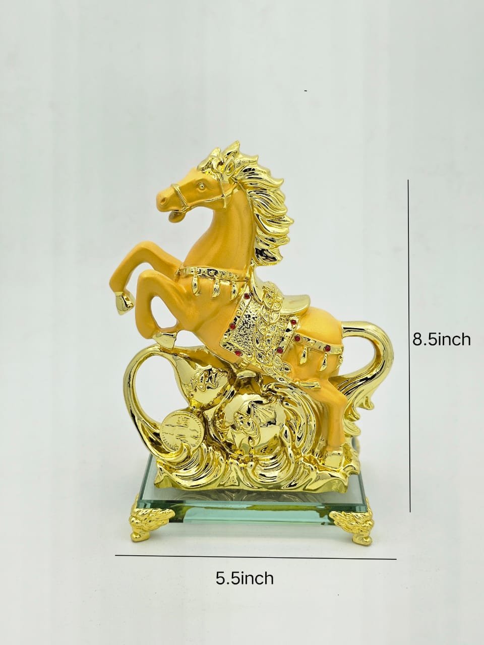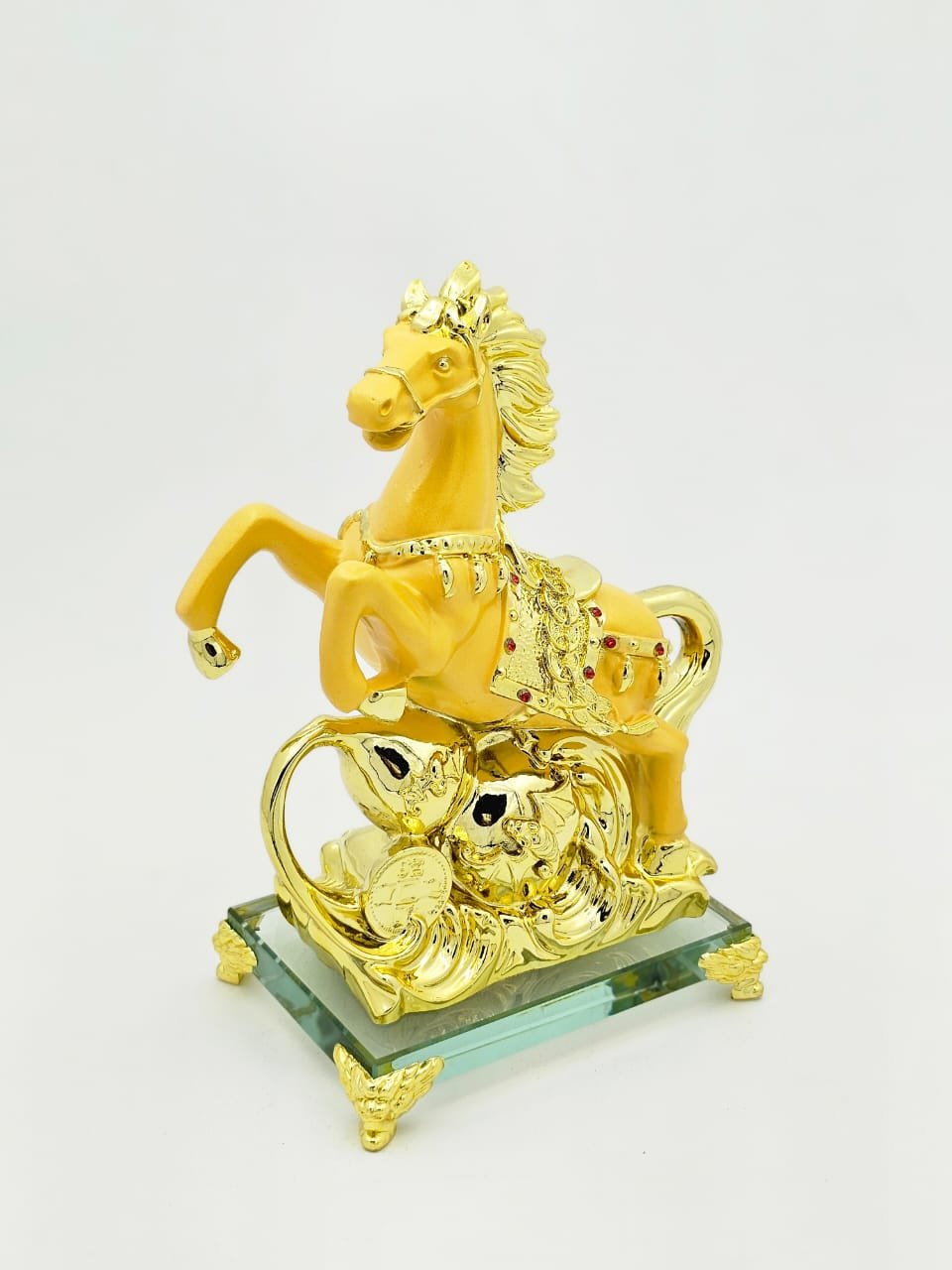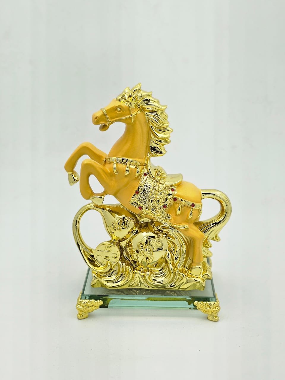 Crafted with utmost attention to detail, our Golden Feng Shui Horse stands out with its radiant gold finish and meticulously sculpted features. The horse is depicted in a dynamic pose, symbolizing movement and progress, which are essential qualities for attracting success. The quality craftsmanship ensures durability, making it a timeless addition to your collection. Displaying this elegant piece in your living space not only adds a touch of opulence but also reinforces your commitment to achieving your goals.